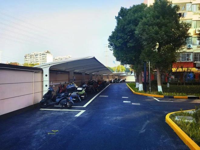 曾经漏水损坏的非机动车棚,经过拆除重建后焕然一新。新车棚不仅外观整洁、结实耐用,更贴心增设了隔火墙和消防设备,消防安全等级有效提升,让居民停车、充电更安心、更放心。